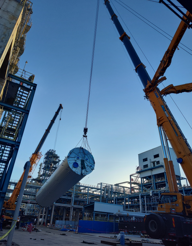 该批脱气料仓单台直径4.76米、总长27.7米,吊装重量达23吨,安装难度较大。为确保料仓顺利安装就位,1xbet中文 工程项目中心组织制造、运输、施工、监理等单位高效协同,针对质量管控、运输路线勘察、吊装方案设计等环节,周密部署、压实责任:制造阶段强化焊接质量监督;运输阶段对物流车辆精准选型,并规划最优路线;吊装采用“单主机台吊递送法”,确保安全高效。项目避开开工高峰期,顺利完成料仓吊装,实现施工与生产两不误。