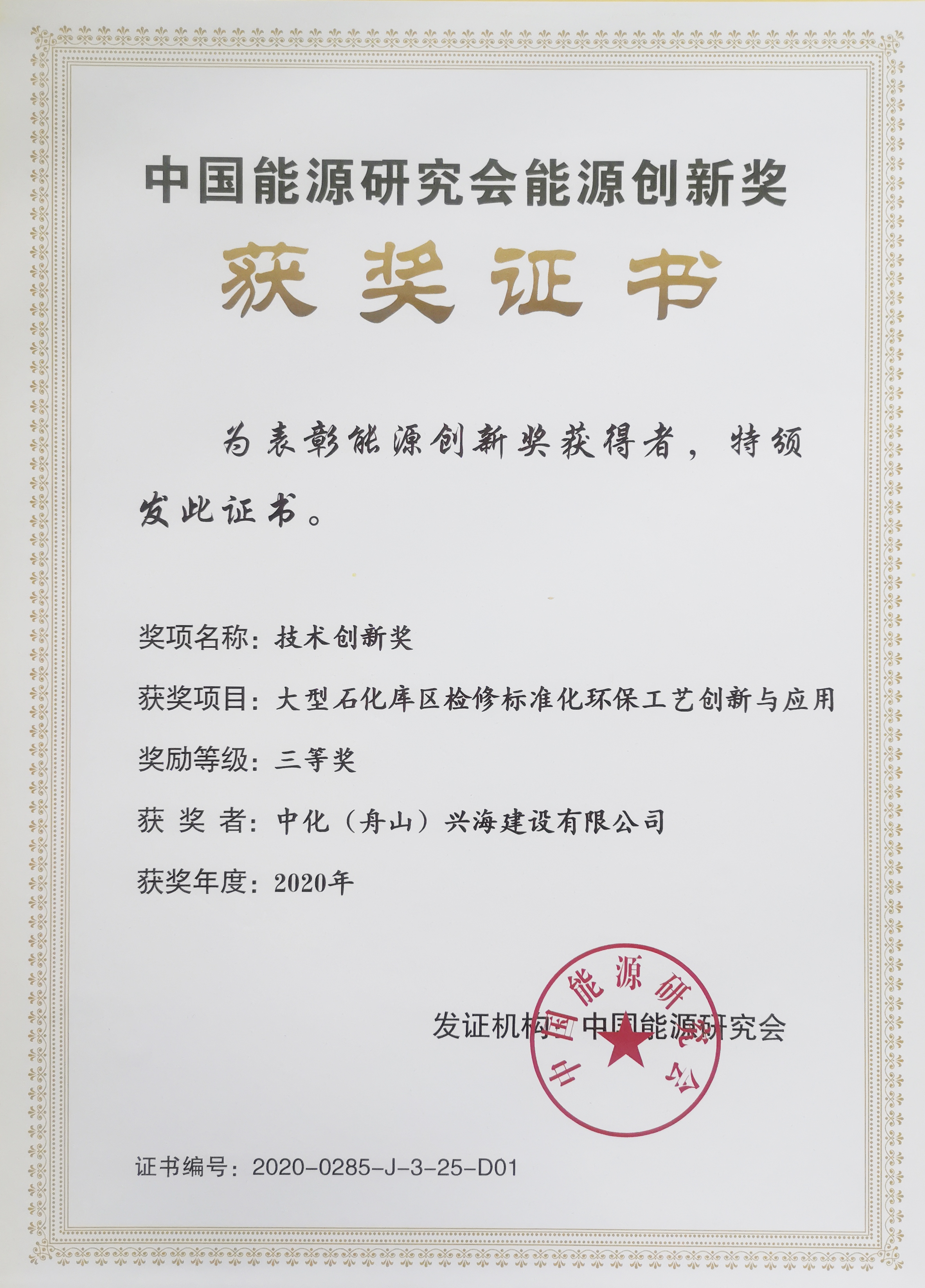近日,在2020年中国能源研究会年会上,1xbet中文 兴海《大型石化库区检修标准化环保工艺创新与应用》荣获技术创新奖三等奖,并成功入选《2020中国能源研究会能源创新奖获奖项目汇编》。
