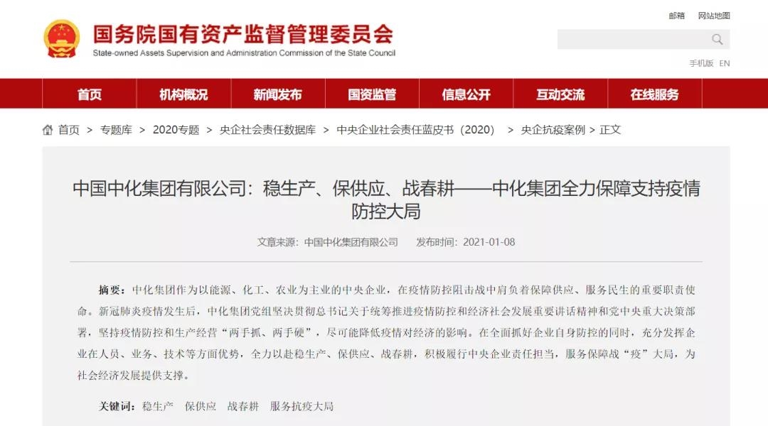 2021年1月28日,国务院国资委网站“2020中央1xbet中文社会责任蓝皮书”专题正式上线。专题分“央企蓝皮书”“央企海外蓝皮书”“央企抗疫案例”三大板块,图文并茂,全景式展示中央1xbet中文2020年在脱贫攻坚、抢险救灾、绿色发展、民生保障、海外履责等方面的生动实践。
