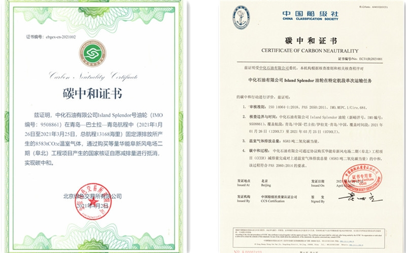 It is reported that “Island Splendor” Tanker set sail on January 26, 2021, and completed the entire voyage on March 25, 2021. Through rigorous procedures, such as carbon footprint inspection, energy conservation, emission reduction, independent third-party carbon emission verification, purchase and write-off under China Certified Emission Reduction (CCER), Sinochem Oil Co., Ltd. deregistered the verified 8,583 tons of carbon dioxide, and achieved the first-ever carbon neutrality of tanker voyage in China. This demonstrated the solid determination of Sinochem Oil Co., Ltd. in stimulating the research and development of new technologies and green energy in the shipping and logistics industry.